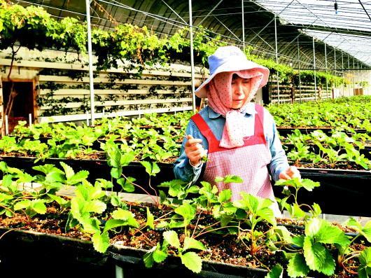 小蝸牛生態(tài)農(nóng)場(chǎng)里,袁愛(ài)麗在打理草莓苗。