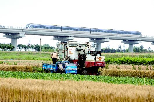 麥浪翻空沃野黃,又到小麥?zhǔn)斋@季節(jié)。6月14日,即墨溫泉街道的麥田里,聯(lián)合收割機(jī)穿梭在金色的麥浪之間,與經(jīng)過的輕軌形成了一道美麗的風(fēng)景。溫泉街道唐家莊的老唐看著自家地里的三畝麥子喜獲豐收,比較開心。老唐一個人來到地頭,啥都不用干,看著聯(lián)合收割機(jī)穿梭幾個來回,拖拉機(jī)就將收獲的麥子直接拉回家了!敖衲晔莻豐收年,我家的麥子畝產(chǎn)一千多斤,一畝地比去年至少多收200多斤!崩咸婆踔溩咏榻B。