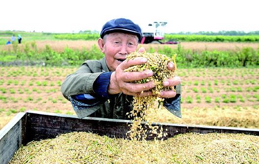 老唐捧起收割機(jī)剛剛收割的麥子。