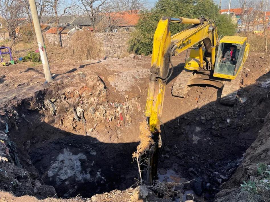 一名正在觀看施工現(xiàn)場(chǎng)的村民告訴記者,村中的河名叫蓮陰河,穿過(guò)村子,連接了龍泉街道多個(gè)村子,最終流入王圈水庫(kù),村中的蓮陰河橋南邊20米,就是正在修建化糞池的現(xiàn)場(chǎng)。記者看到,此時(shí)正有3臺(tái)挖掘機(jī)在同時(shí)工作,目前最深處,已經(jīng)挖至地下10米左右,坑底滲出不少河水。在這個(gè)深坑背后的兩三米外,就是蓮陰河的河道。