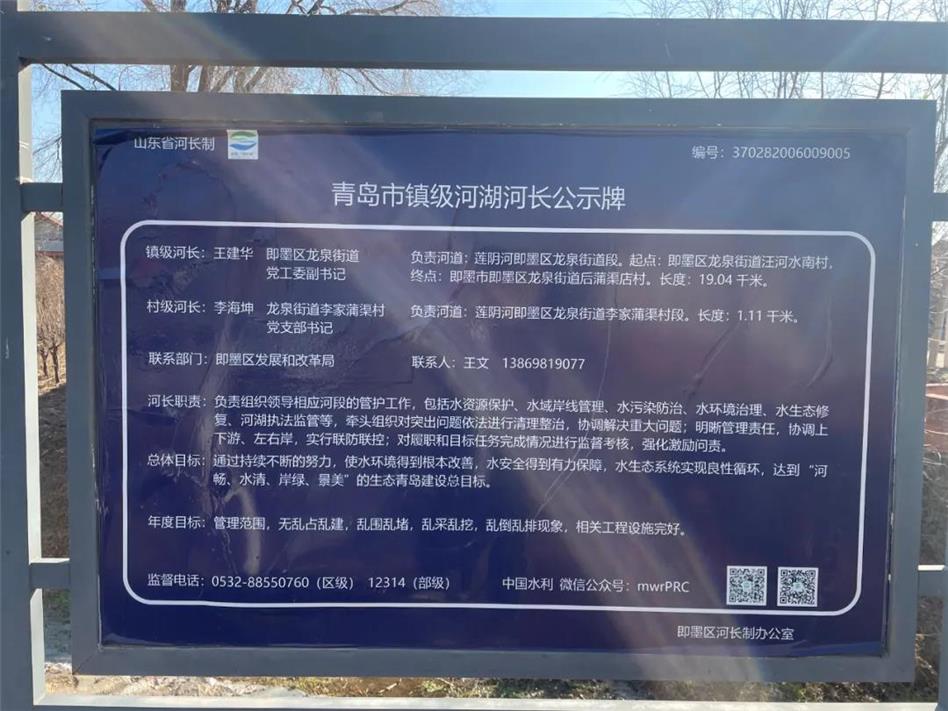 記者從村中的青島市鎮(zhèn)級(jí)河湖河長(zhǎng)公示牌中了解到,蓮陰河全長(zhǎng)19.04千米,流經(jīng)李家蒲渠村村的河段,長(zhǎng)度為1.11千米。該河鎮(zhèn)級(jí)河長(zhǎng)鎮(zhèn)級(jí)河長(zhǎng)為龍泉街道黨工委副書(shū)記王建華,村級(jí)河長(zhǎng)為龍泉街道李家蒲渠村黨支部書(shū)記,聯(lián)系部門(mén)為即墨區(qū)發(fā)改局,聯(lián)系人為王文。