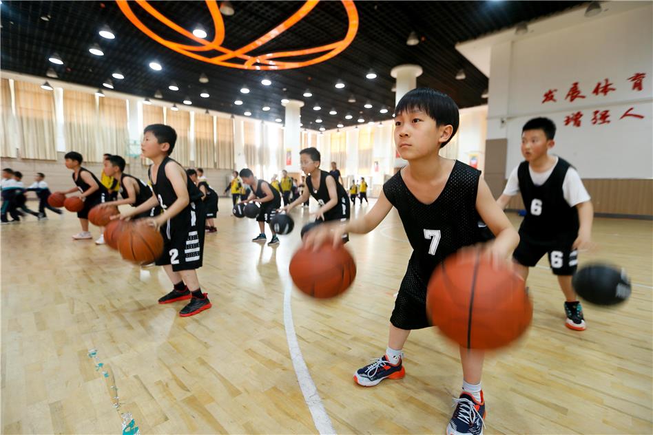 4月19日,青島通濟(jì)實(shí)驗(yàn)學(xué)校學(xué)生在大課間活動(dòng)中進(jìn)行籃球運(yùn)球訓(xùn)練。