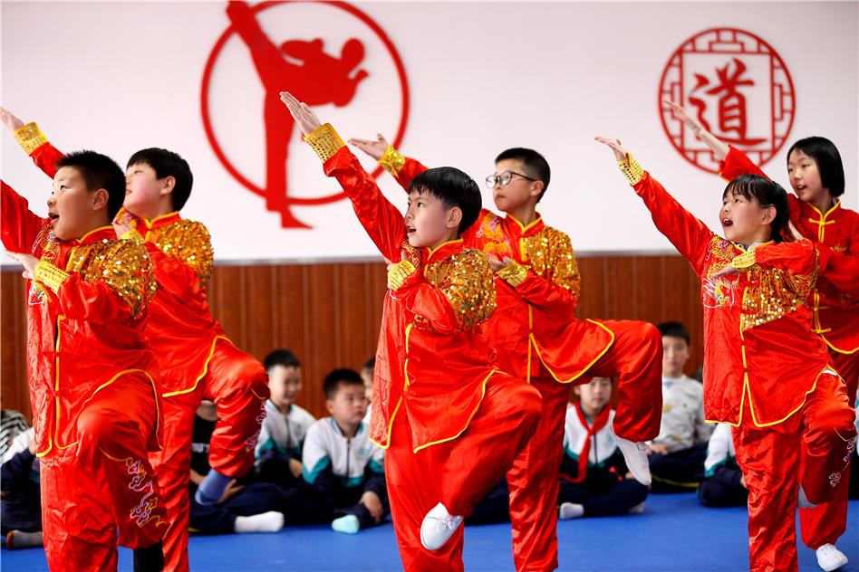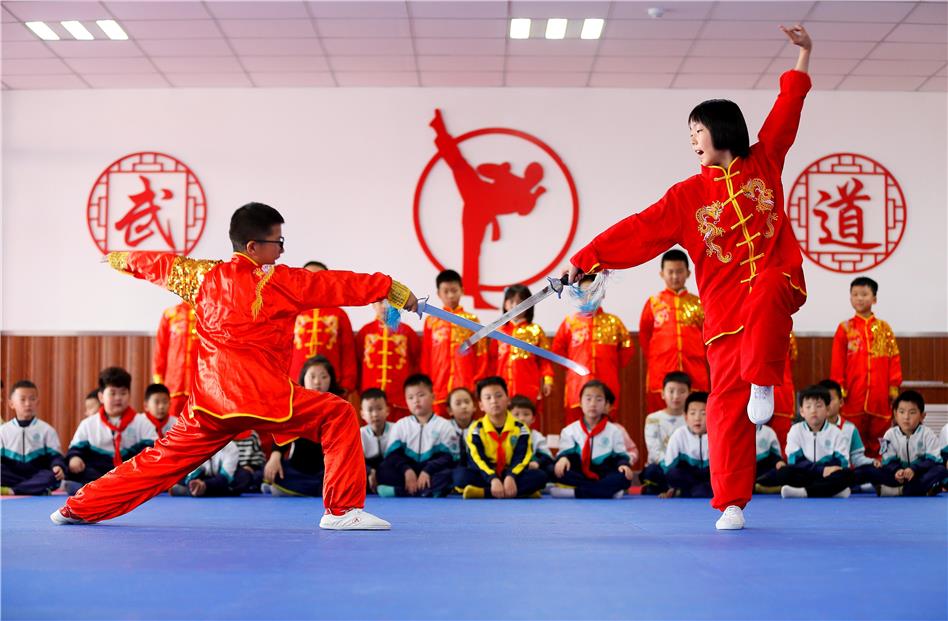 4月19日,青島通濟(jì)實(shí)驗(yàn)學(xué)校學(xué)生在大課間活動(dòng)中學(xué)習(xí)武術(shù)。