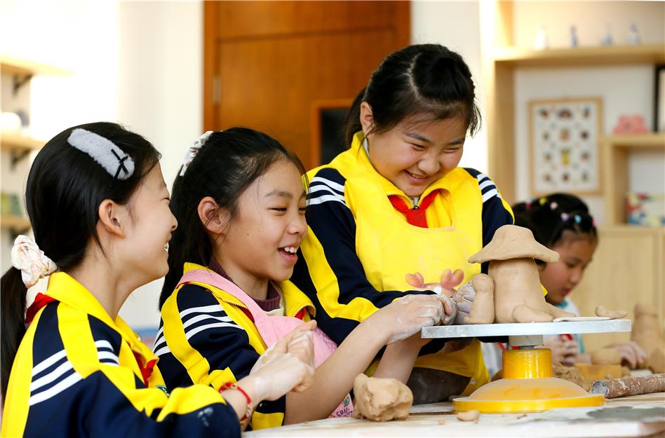 4月19日,青島通濟(jì)實(shí)驗(yàn)學(xué)校學(xué)生在大課間活動(dòng)中學(xué)習(xí)陶藝。