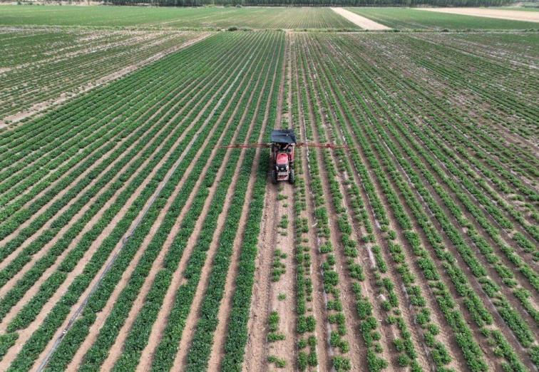 段泊嵐鎮(zhèn)趙戈莊村農民駕駛拖拉機在為花生噴灑農藥