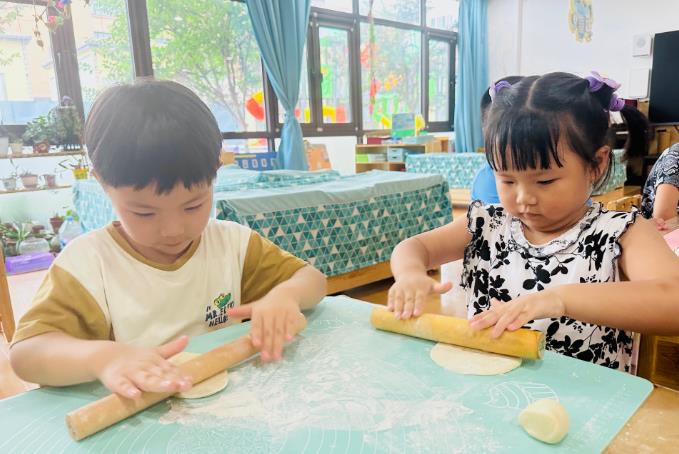活動(dòng)前,教師帶領(lǐng)幼兒了解了秋分的由來、習(xí)俗并提前準(zhǔn)備了紅豆、面團(tuán)、搟面杖等材料。活動(dòng)中,小朋友們一起做豆包,取一團(tuán)面團(tuán),在手心中揉成圓形,用搟面杖將面團(tuán)搟制成圓餅,將豆沙餡放置在圓餅中央,將面團(tuán)開口捏合,團(tuán)成圓圓的豆包。隨后放入蒸箱里,蒸熟后,小朋友們共同品嘗自己的勞動(dòng)成果