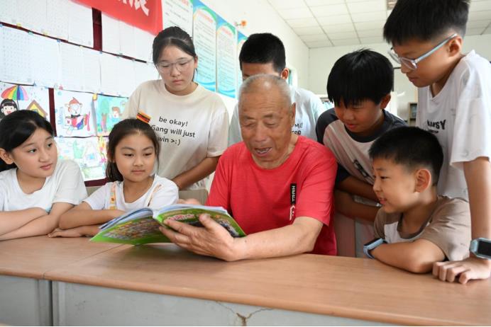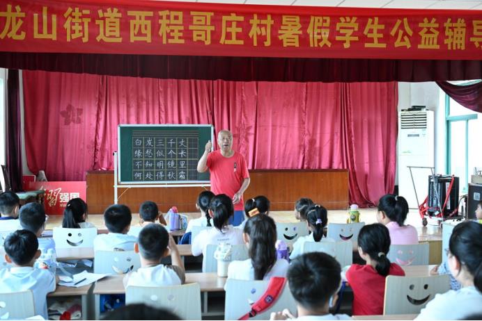 “爺爺好!”“孩子們好,請坐下。”“謝謝爺爺!”7月16日,即墨區(qū)龍山街道西程哥莊村文化大院的暑期公益“課外輔導(dǎo)班”又開課了。在課堂上,四十多名小學(xué)生整齊端坐,目光專注地投向講臺中央。那里,90歲高齡的江敦仁老人正進(jìn)行著新一年暑期公益輔導(dǎo)班的“開學(xué)第一講”。