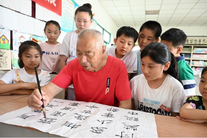 “我們學(xué)習(xí)的是撇、點(diǎn)、捺……”7月16日,在山東省青島市即墨區(qū)龍山街道西程哥莊村的暑假公益托管班上,90歲的江敦仁正耐心地指導(dǎo)小學(xué)生寫毛筆字。還有20多名小朋友都在認(rèn)真地學(xué)習(xí)毛筆字。今年已經(jīng)是江敦仁從中學(xué)校長的崗位退休后的第20年在暑假公益托管班教孩子們學(xué)習(xí)書法。