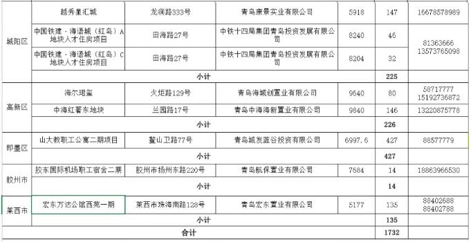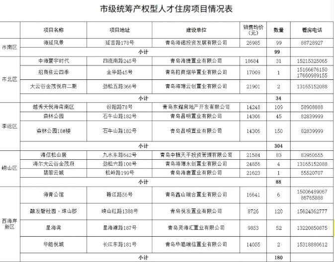小編注意到,情況表中包括市南區(qū)1個(gè)項(xiàng)目、市北區(qū)3個(gè)項(xiàng)目、李滄區(qū)3個(gè)項(xiàng)目、嶗山區(qū)3個(gè)項(xiàng)目、西海岸新區(qū)4個(gè)項(xiàng)目、城陽區(qū)3個(gè)項(xiàng)目、高新區(qū)2個(gè)項(xiàng)目、即墨區(qū)1個(gè)項(xiàng)目、膠州市1個(gè)項(xiàng)目、萊西市1個(gè)項(xiàng)目。名單中既有這些在售產(chǎn)權(quán)型人才住房項(xiàng)目的名稱、具體地址,還包含建設(shè)單位、銷售均價(jià)、數(shù)量以及看房電話。