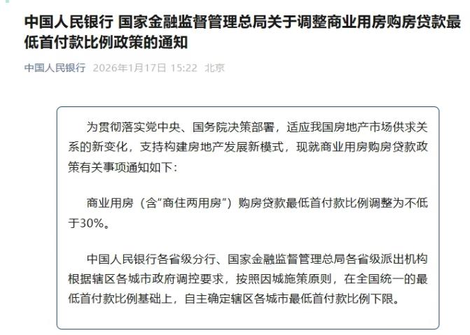兩部門:商業(yè)用房購房貸款最低首付款比例調(diào)整為不低于30%